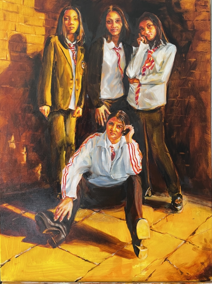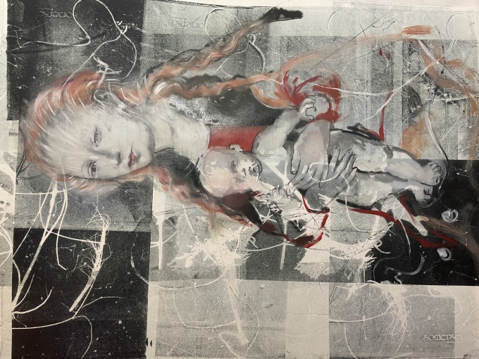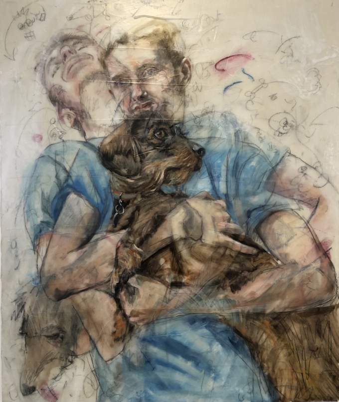 "My Automatic mark making techniques combine with observation to explore subconscious states; relationships to our body, sensation, pain and self image. Mono-printing, oil bars, graphite, stencils, acrylic sprays, gels and layering add to the visual language and expression. From this I may get slightly closer to expressing the feeling of stroking my dog , a tooth ache to something as profound as interacting with a relative with dementia or personal trauma."
